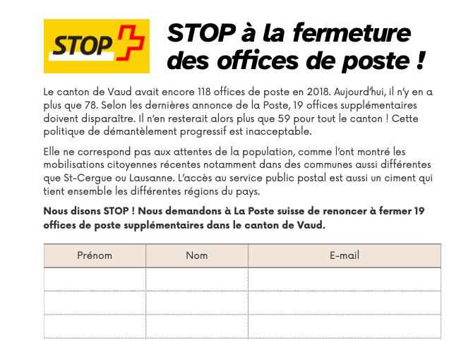 Nous disons STOP ! Nous demandons à La Poste suisse de renoncer à fermer 19 offices de poste supplémentaires dans le canton de Vaud.